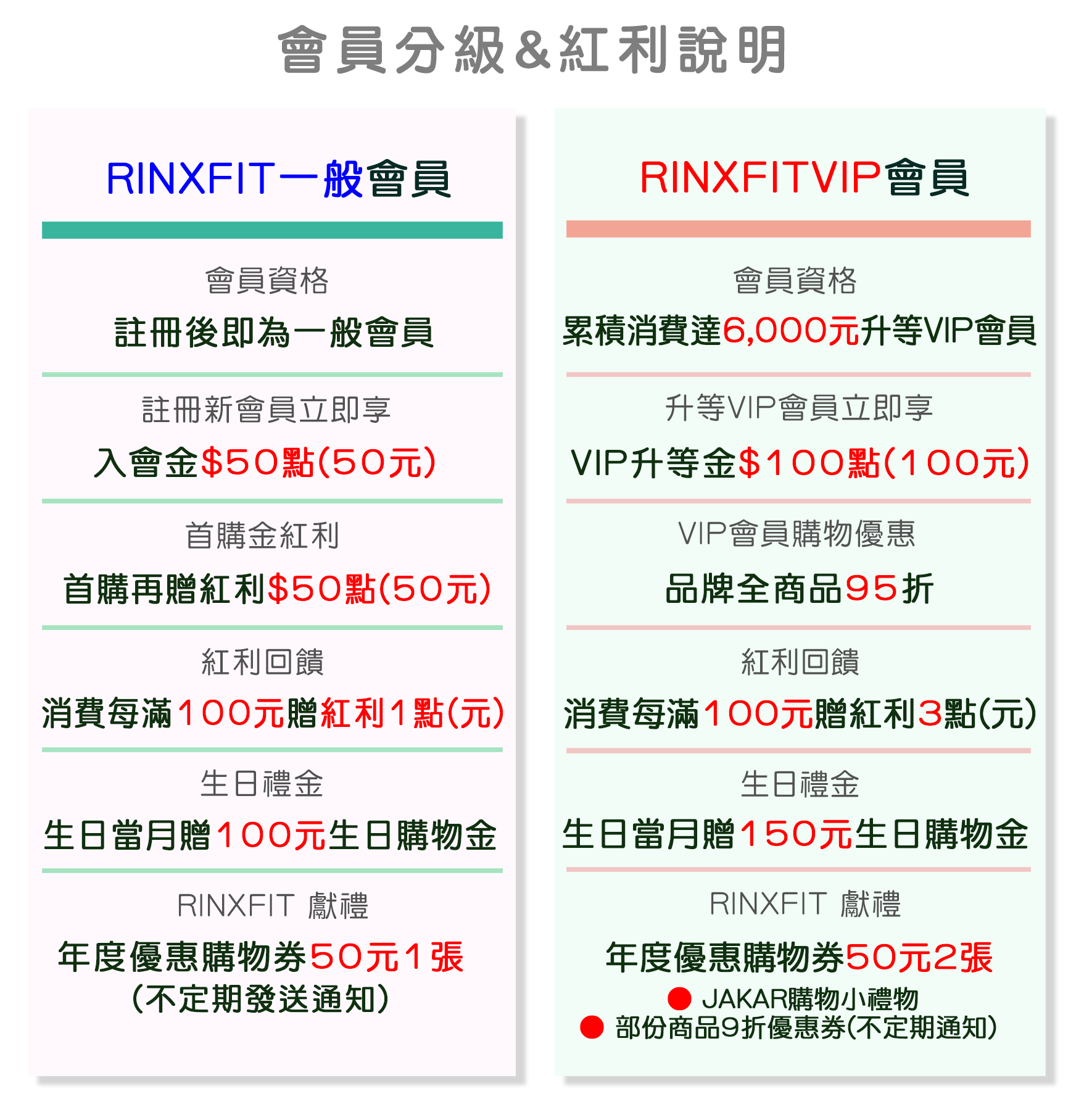 ● RINXFIT VIP 會員:年度累積消費達6,000元,可升等為 RINXFIT VIP 會員